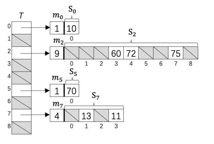 将数据通过一级 Hash 映射到 T 空间中,然后冲突的数据随机选取新的哈希函数映射到 S 空间中,且 S 空间的大小 m 是冲突数据的平方(例如 T2 中有三个数字产生冲突,则映射到 m 为 9 的 S2 空间中,m 即为避免桶内 Hash 冲突的参数),此时可以容易找到避免碰撞的哈希函数(这个避免冲突的过程称为 position 或者 displace)。最差情况下所需存储空间为 O(n2),但只要适当选择哈希函数减少一级哈希时的碰撞,则可以使预期存储空间为 O(n)
