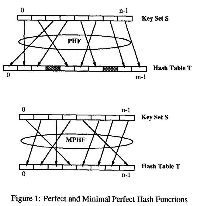 Perfect Hash Function 对于给定的集合 S,可以将 S 中所有的 Key 映射到整数 [0, m) 中,其中 m >= |S|。当 m = |S| 时,称为最小完美 Hash 函数(Minimal Perfect Hash Function, MPHF)。即作为一个特例,如果完美 Hash 可以将 N 个 key 映射到 0 到 N-1 的整数,那它可以被称为最小完美 Hash 函数。