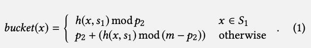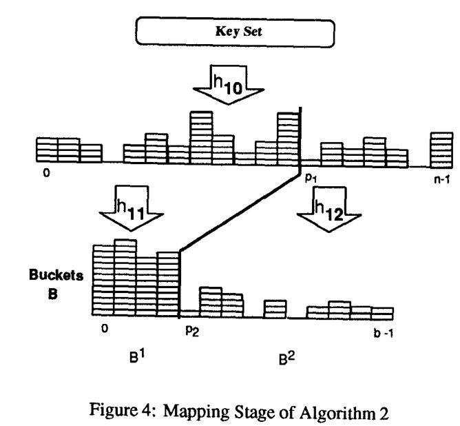 Mapping 阶段为了将 60% 的 key 分布到 30 % 的桶里,将 n 个 key 分为 S1 和 S2 两个集合,其中 S1 称为 dense set,key 的数量大概保持在 0.6 * n,S2 为 sparse set,key 的数量大概在 0.4 * n 左右。同时,把所有桶分为两个部分 B1 和 B2,B1 数量 p2 = 0.3 * m,称为 dense buckets,B2 数量 0.7 * m,称为 sparse bucket。使用普通的 Hash 函数如 Cityhash/MurmurHash,将 S1 通过 H1 映射到 B1 中,同样道理将 S2 通过 H2 映射到 B2 中。