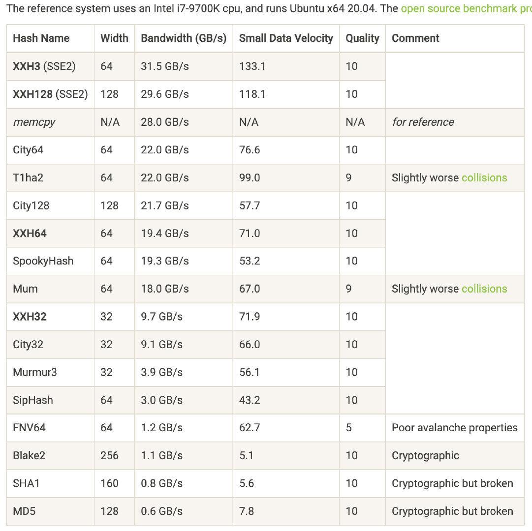 xxHash 的 benchmark,统计了常用 Hash 函数的性能:
