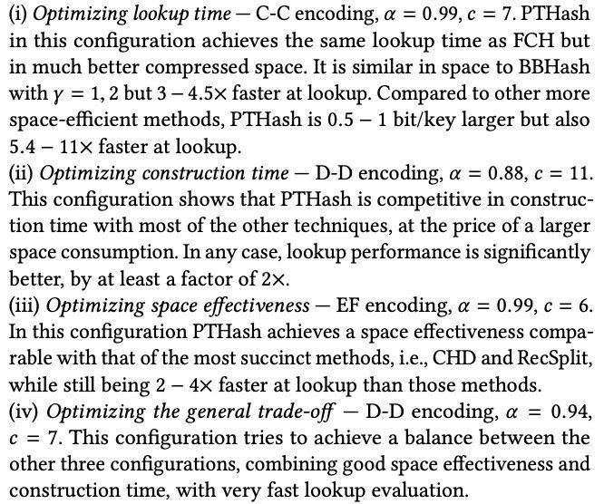 虽然 CHD 实现简单,但其中包含了大量除法求余计算,Encoding 后效率并不高,lookup 耗时过久。最近有一篇文章提出了 PTHash 方法,在 FCH 上改进了构建时间,并提高了空间利用率,作者还提供了**源代码**供参考。