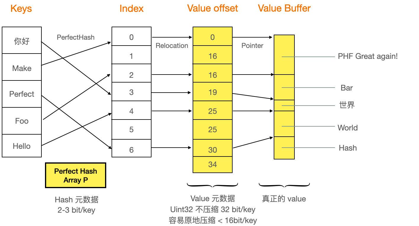 PerfectHashMap 一般用法是先离线生成 map 信息,再读到 buffer 里,或者像 rust-phf 一样编译时内置到二进制,直接读 P 数组,如果 HashMap 特别大,还可以通过 mmap 只读方式载入到内存中。