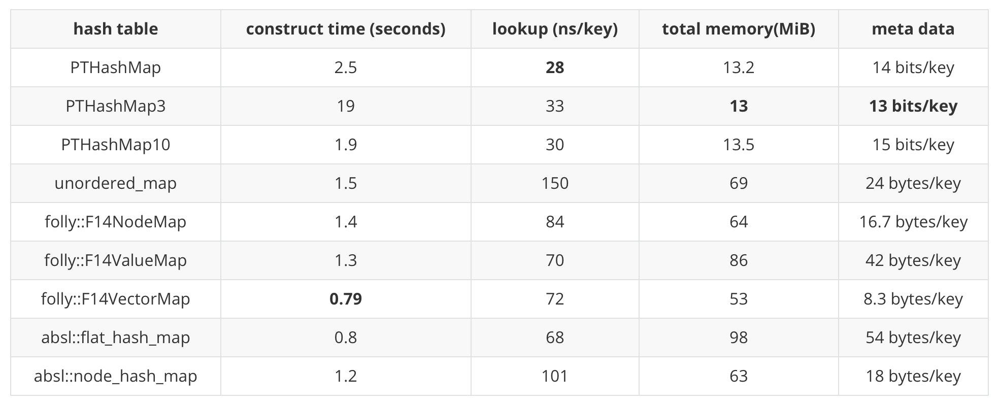 • PTHashMap10:与 PTHashMap 参数不同:c = 10, alpha=0.94。